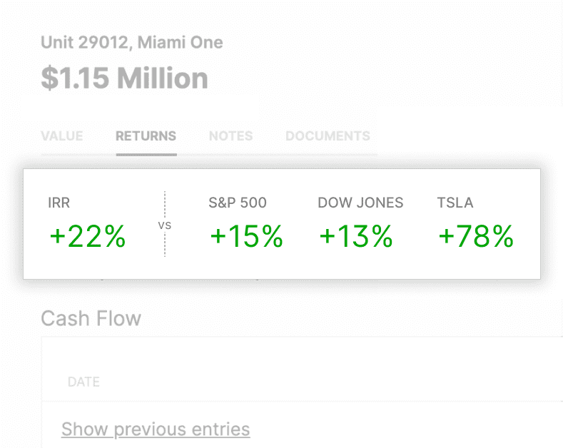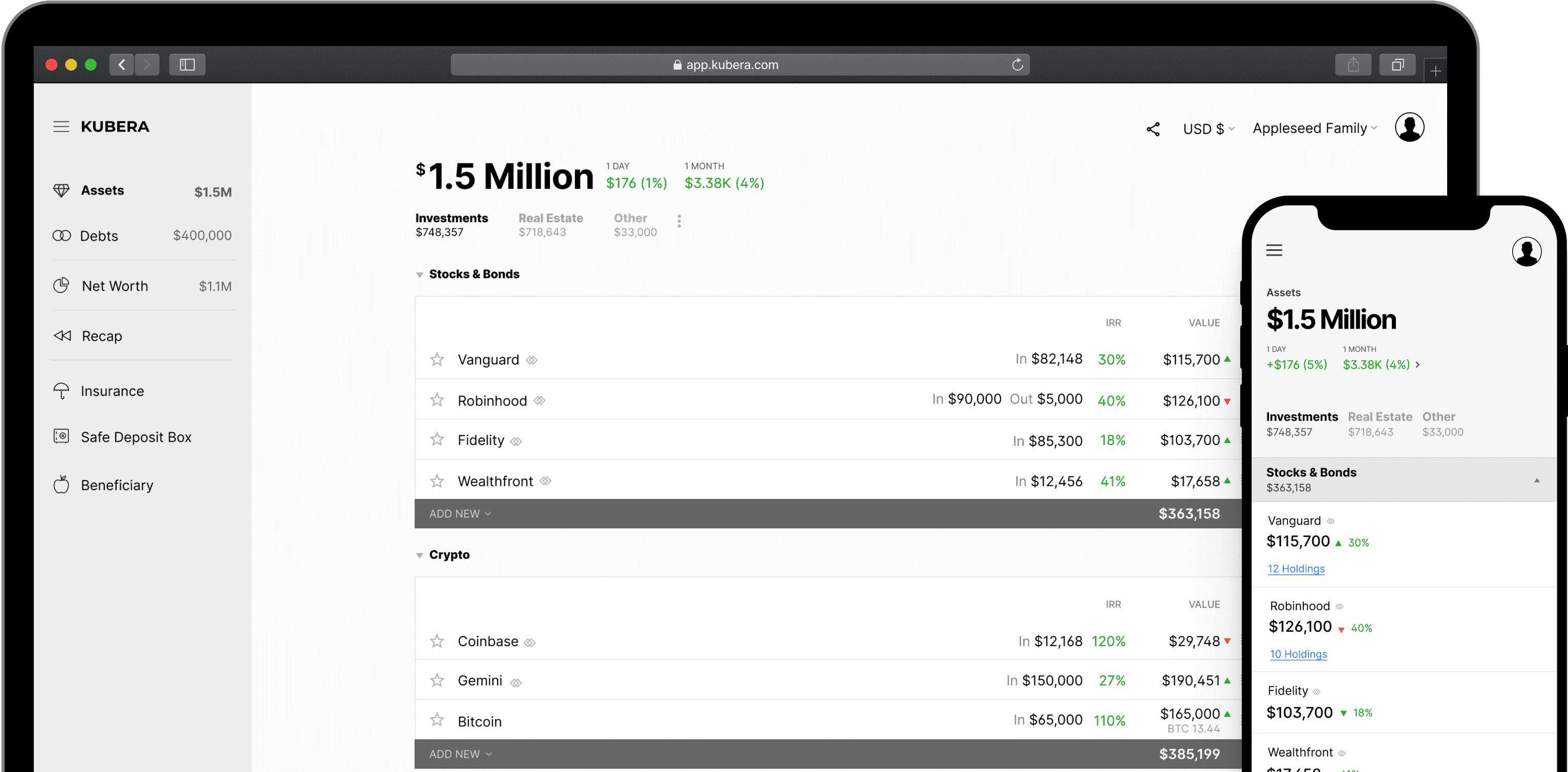Kubera calculates accurate rate of returns (IRR) for all your investments based on the multiple contributions & withdrawals and the time invested. It also benchmarks the IRR with the returns from popular indices and tickers (S&P 500, Dow Jones, AAPL, BTC etc.). Learn more