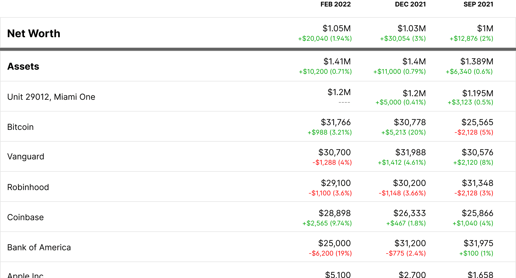 See how your net worth grew over time. See which assets appreciated the most. See how your debts came down. Keep an eye on your asset allocation.
